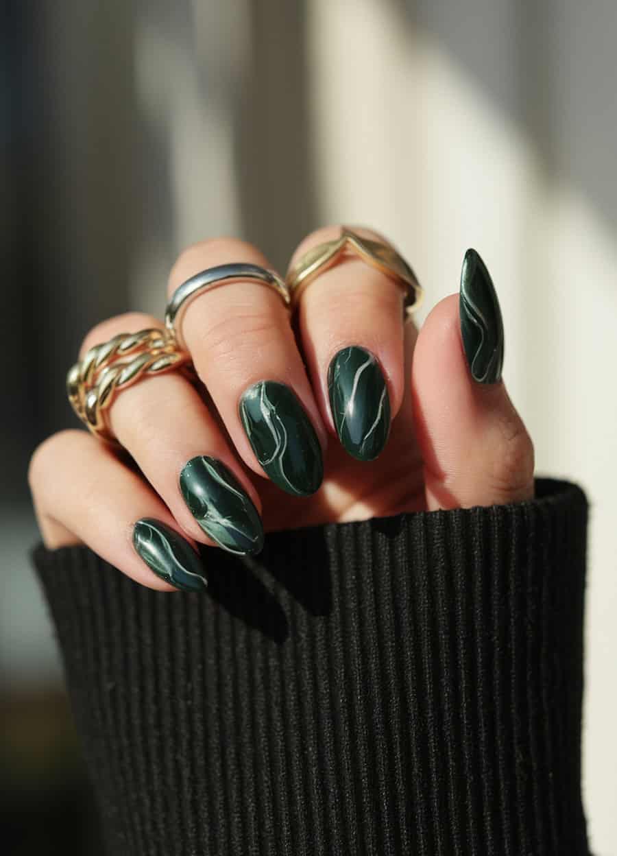 Soft green lines marbled through the dark green nail polish create a soft, subtle aesthetic that's perfect for this time of year.