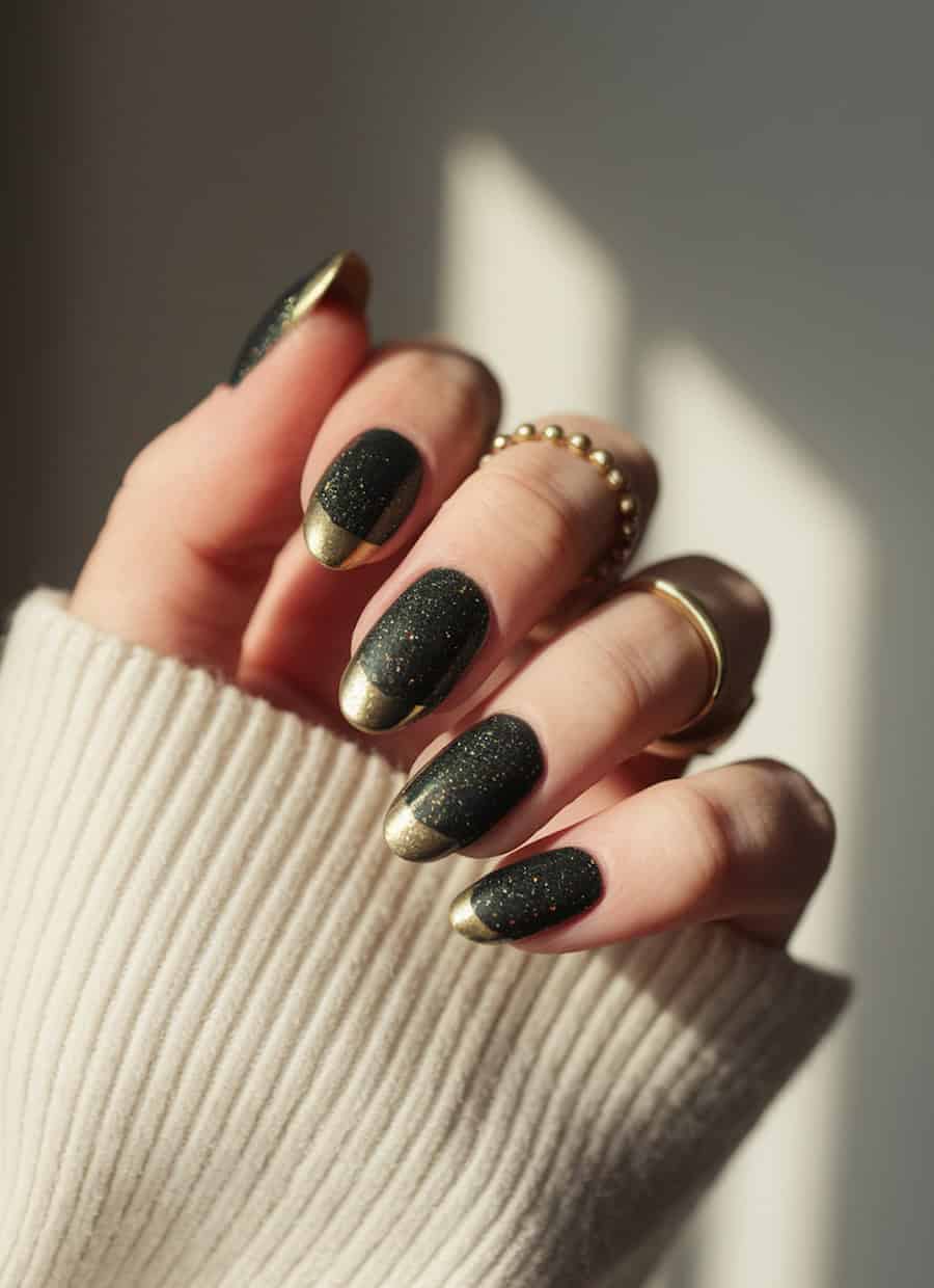 I love the subtle contrast of green here, and the shiny gold details make this nail design a perfect choice for winter.