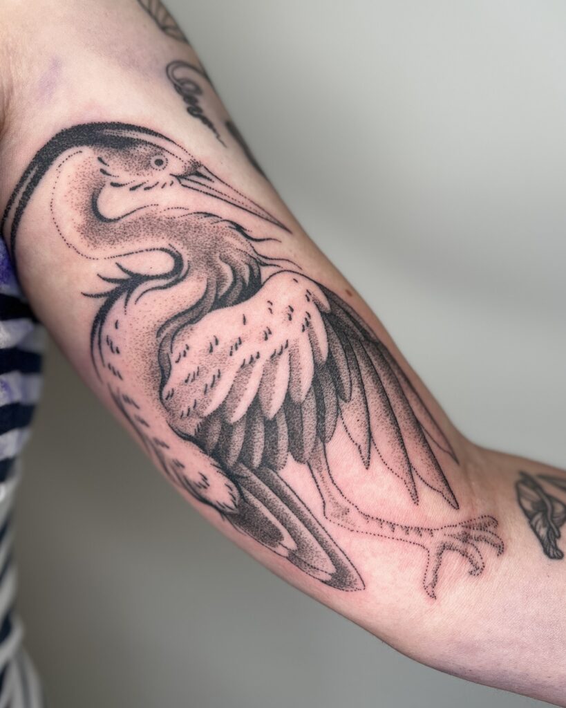 This detailed heron tattoo uses fine dotwork and shading to create a graceful, elongated bird. Its long neck and carefully drawn feathers give it a serene, almost meditative feel. The placement on the inner arm creates a bold yet intimate statement.