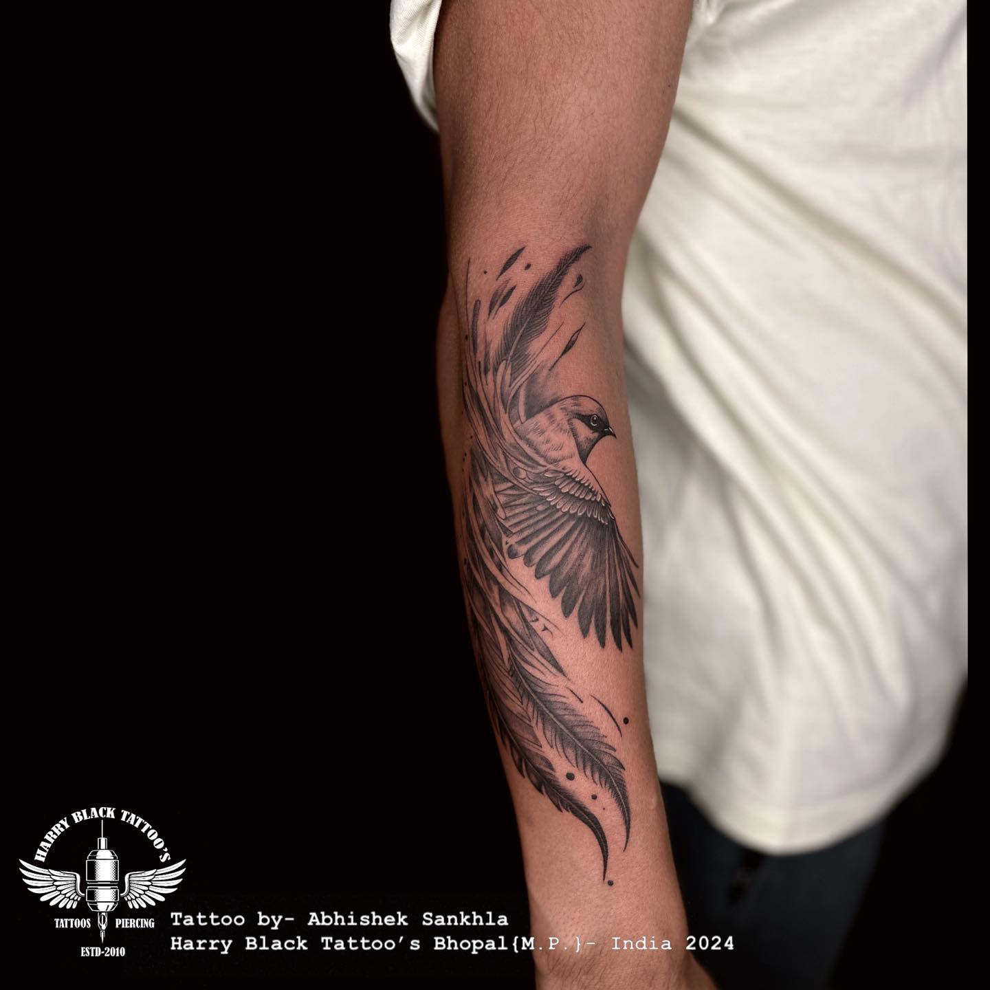This forearm tattoo captures a bird mid-flight, surrounded by a sweeping feather and ink splashes that create a sense of motion. The intricate shading gives depth and energy to the design, making it visually striking.