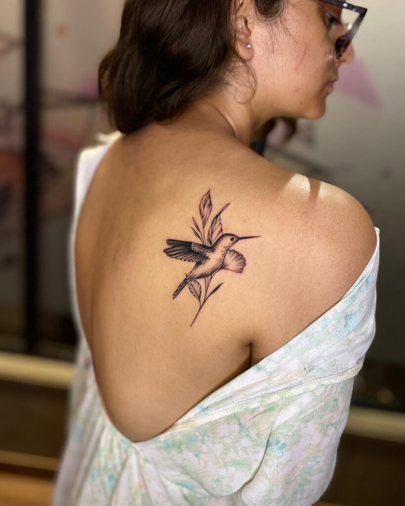 This tattoo depicts a delicate hummingbird hovering beside leaves, beautifully placed on the upper back. The fine lines and soft shading give it a light, airy feeling that mirrors the real bird’s graceful motion.