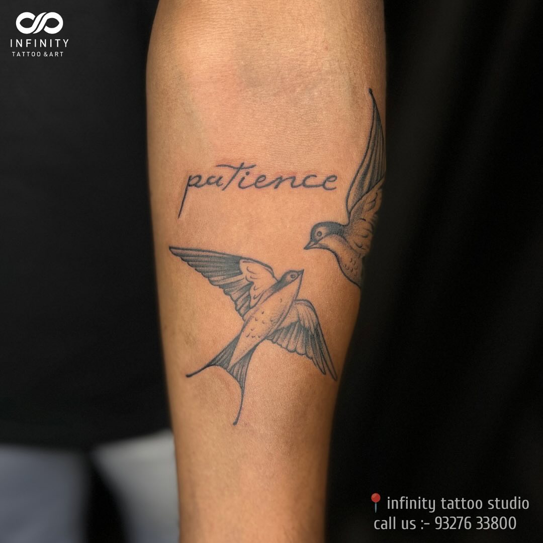5. “Patience” with Flying Birds Forearm Tattoo