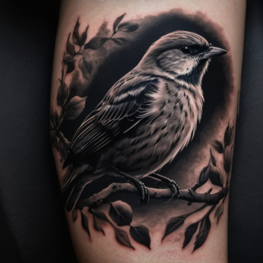 This tattoo features a lifelike sparrow perched on a branch, framed by leaves and a smoky, dark background. The high-contrast shading creates depth and makes the bird look almost three-dimensional.