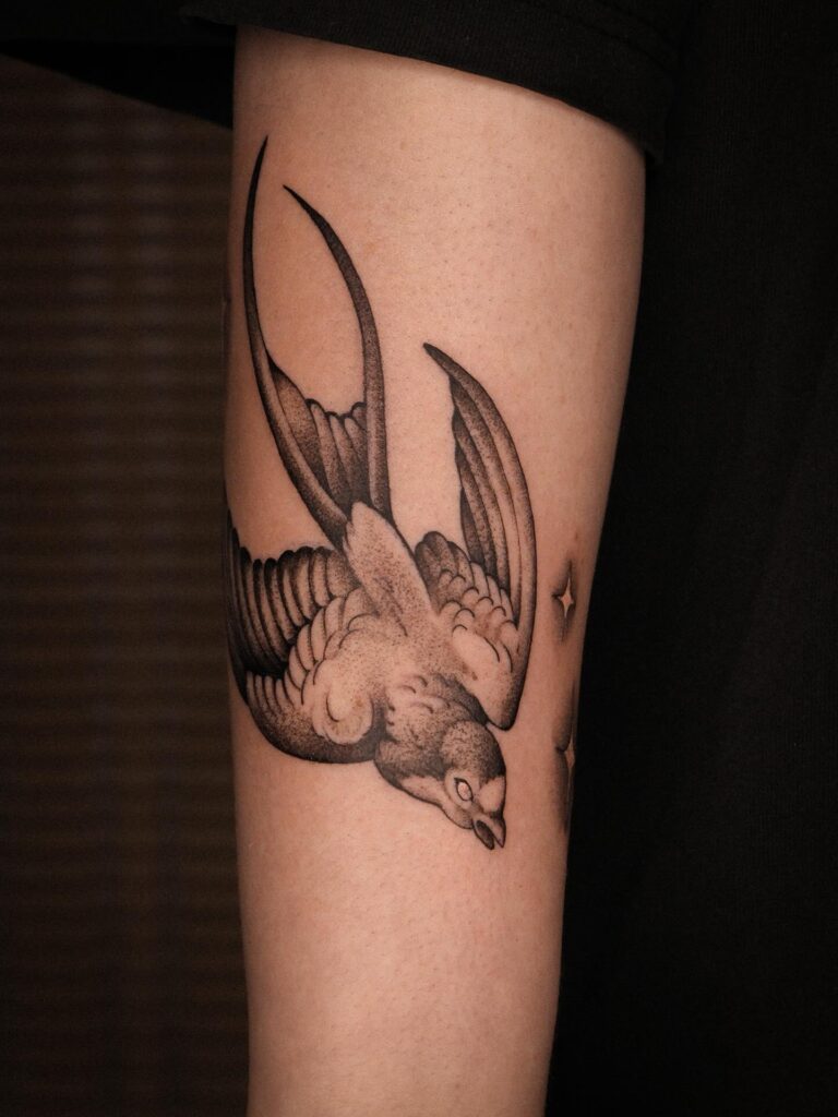 This tattoo features a swallow diving gracefully, shaded with smooth gradients to create a vintage-inspired look. The detail in the wings and tail feathers adds realism and character to the design.