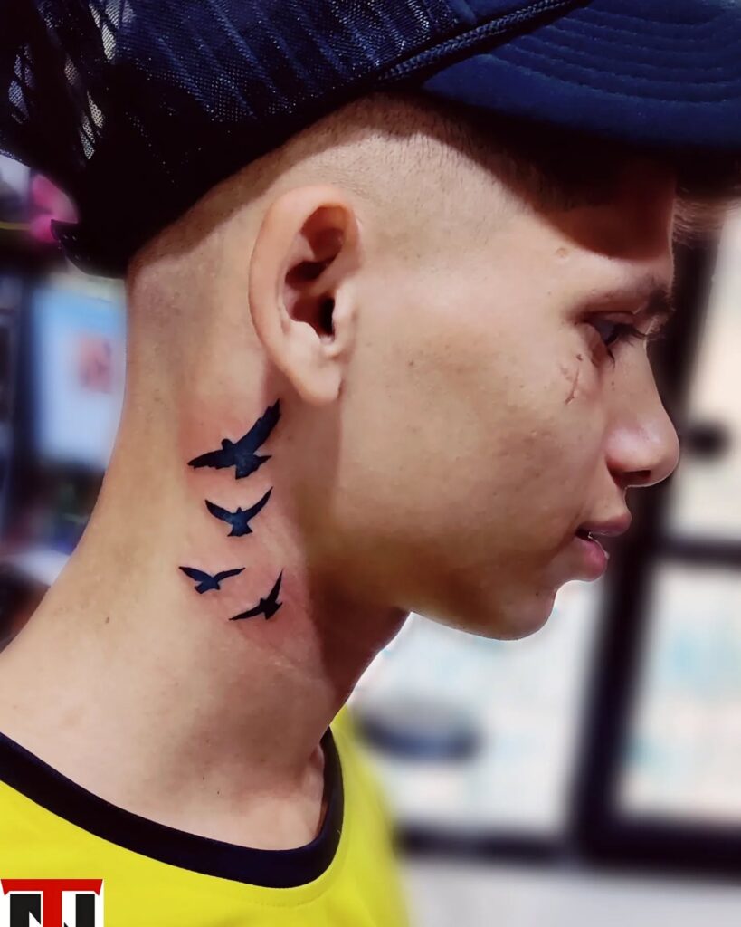 This tattoo shows a series of silhouetted birds flying upward behind the ear and along the neck. The minimalist style keeps it subtle yet eye-catching.