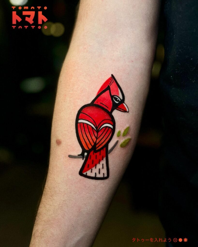 Cardinals symbolize vitality, passion, and a message from loved ones who have passed. This tattoo is perfect for someone who wants to carry a daily reminder of strength, love, and presence, while also sporting a design that is playful, eye-catching, and modern.