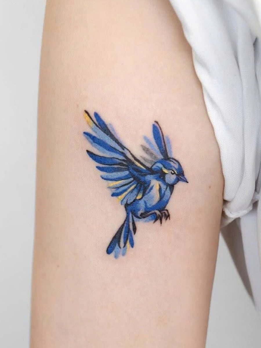 This tattoo captures a lively blue bird mid-flight, with vibrant shades of blue and hints of yellow accentuating its wings. The design feels light, cheerful, and full of motion, making it a perfect choice for someone who wants a pop of color.