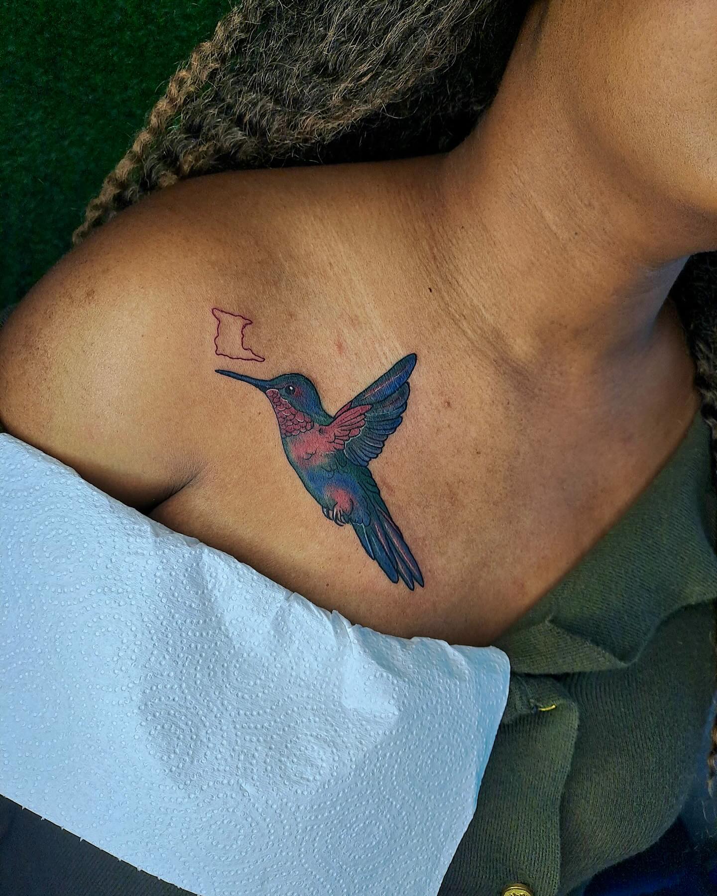 14. Vibrant Hummingbird Collarbone Tattoo