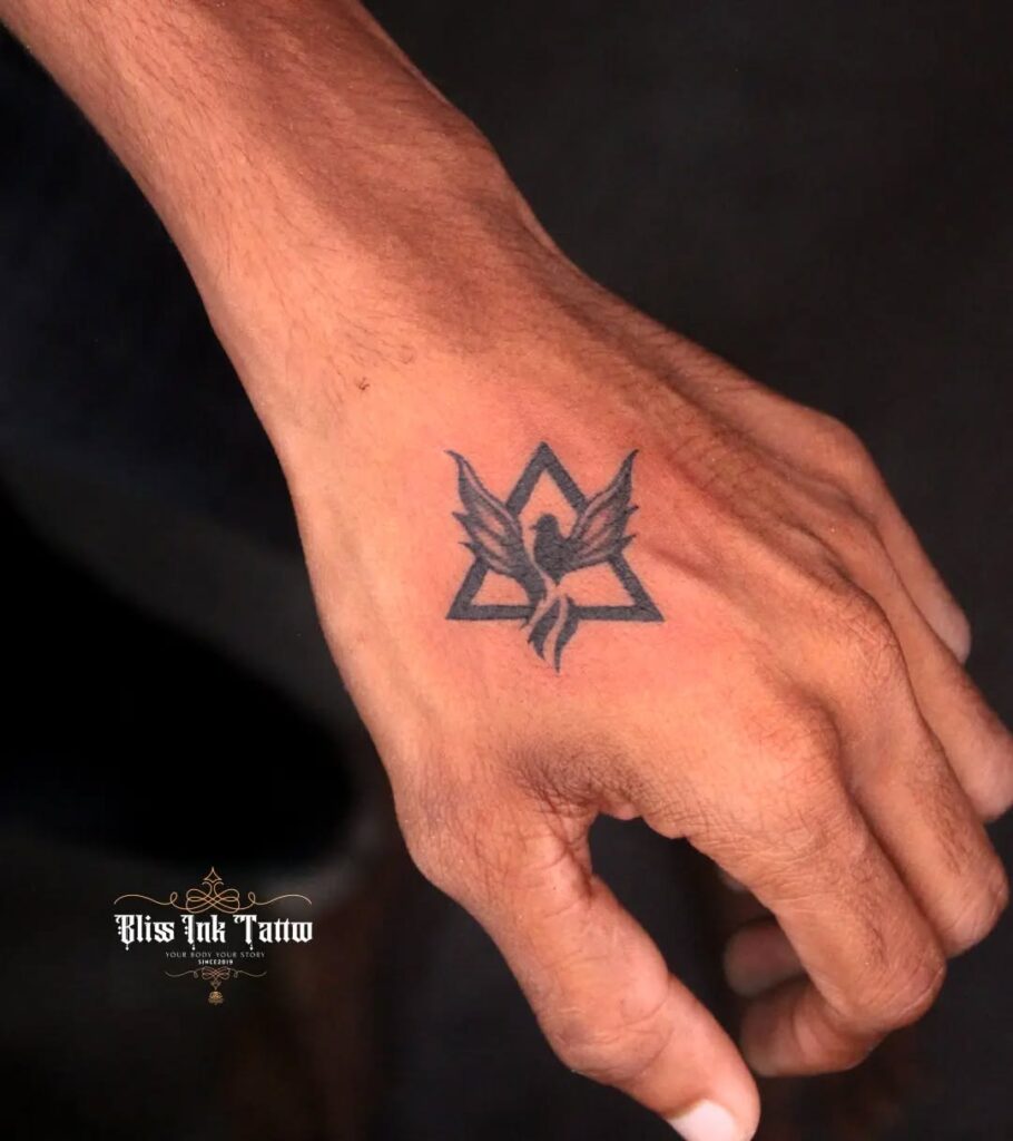This tattoo features a small phoenix rising within a bold triangular outline, perfectly centered on the hand. The clean lines of the triangle contrast beautifully with the flowing wings, giving the design a balanced, modern feel.