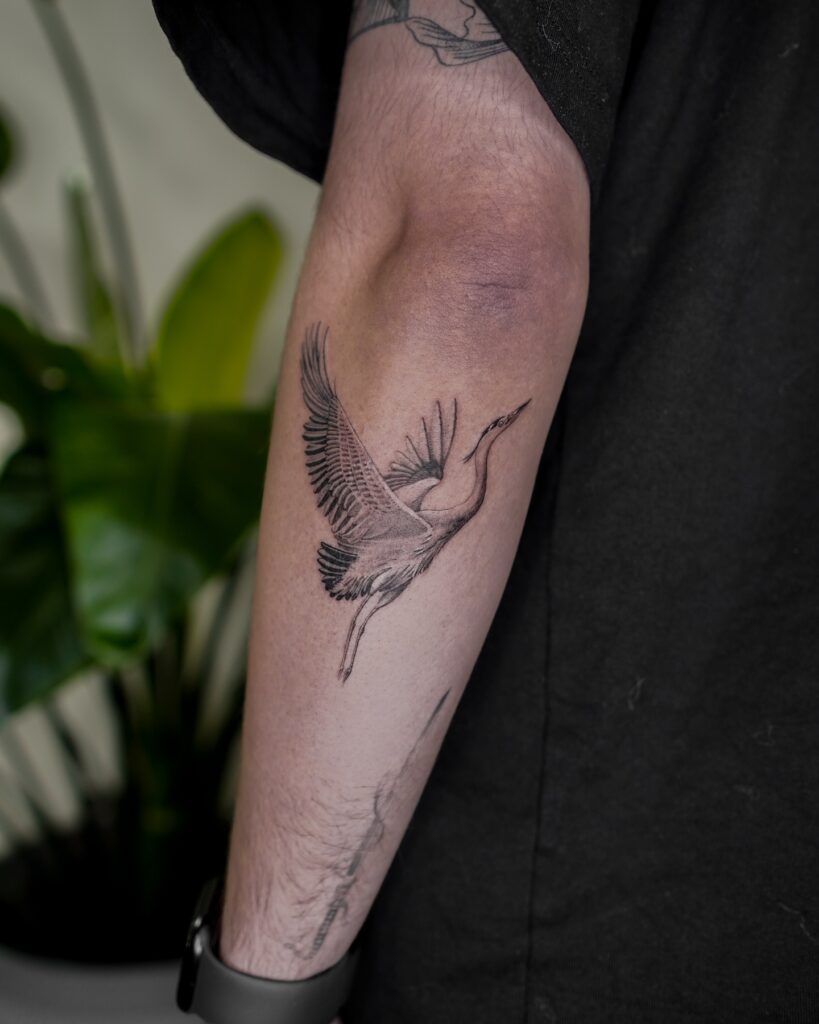 This elegant crane tattoo shows the bird with wings extended as if it’s gracefully taking off. The fine black linework highlights the delicacy of its feathers while emphasizing its long, slender form.