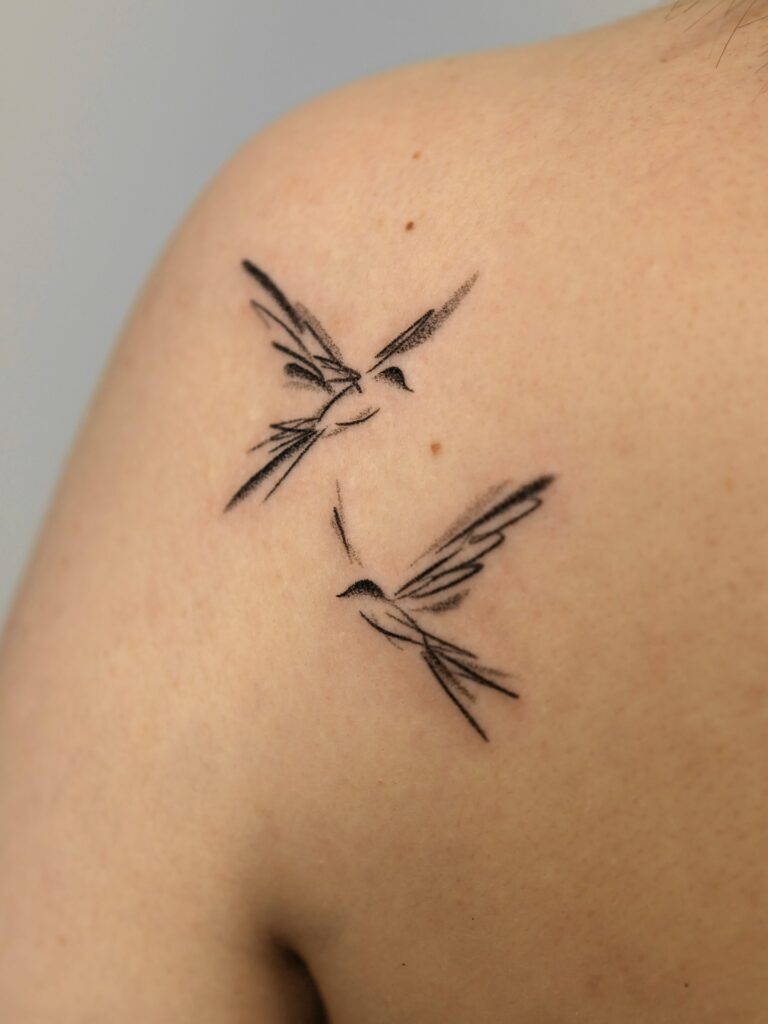 This tattoo features two abstract birds in flight, sketched with fine, painterly strokes. The minimalistic design captures freedom and lightness, making it perfect for someone who values subtle expression. Placed on the upper shoulder, the tattoo flows naturally with the body’s curve.