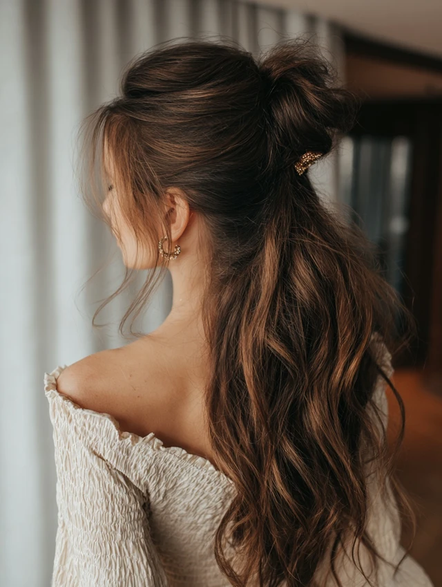 Why It Works: Laid-back but stylish—a quick way to keep long hair up without losing the carefree vibe.
