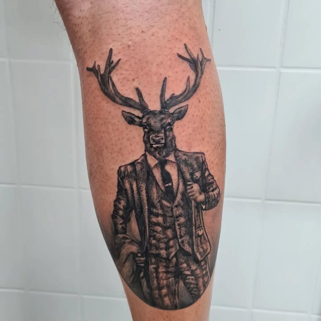 A creative twist on the traditional stag tattoo, this design features a stag head on a sharply dressed human body, complete with a three-piece suit. The monochrome shading highlights the texture of the suit and antlers, creating a sophisticated yet surreal look.