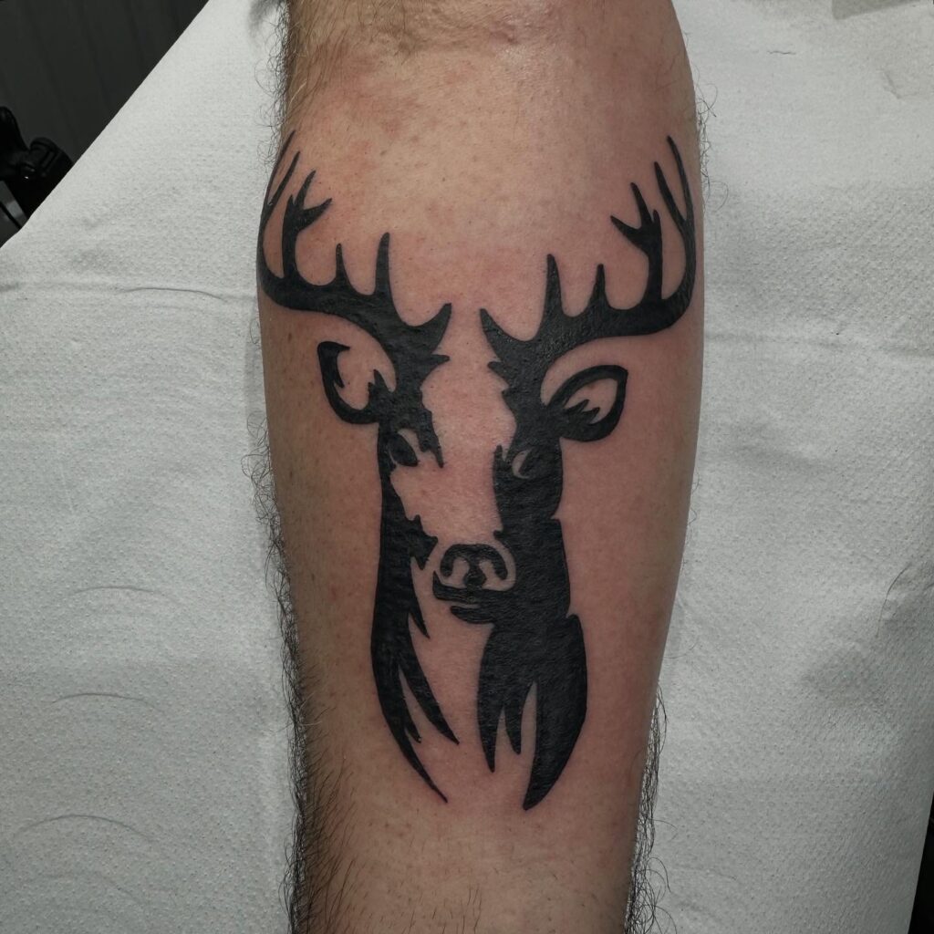 This striking tattoo uses solid blackwork to create the head of a stag with tall antlers. The clean, negative space outlines make it a powerful, high-contrast design that pops against the skin.