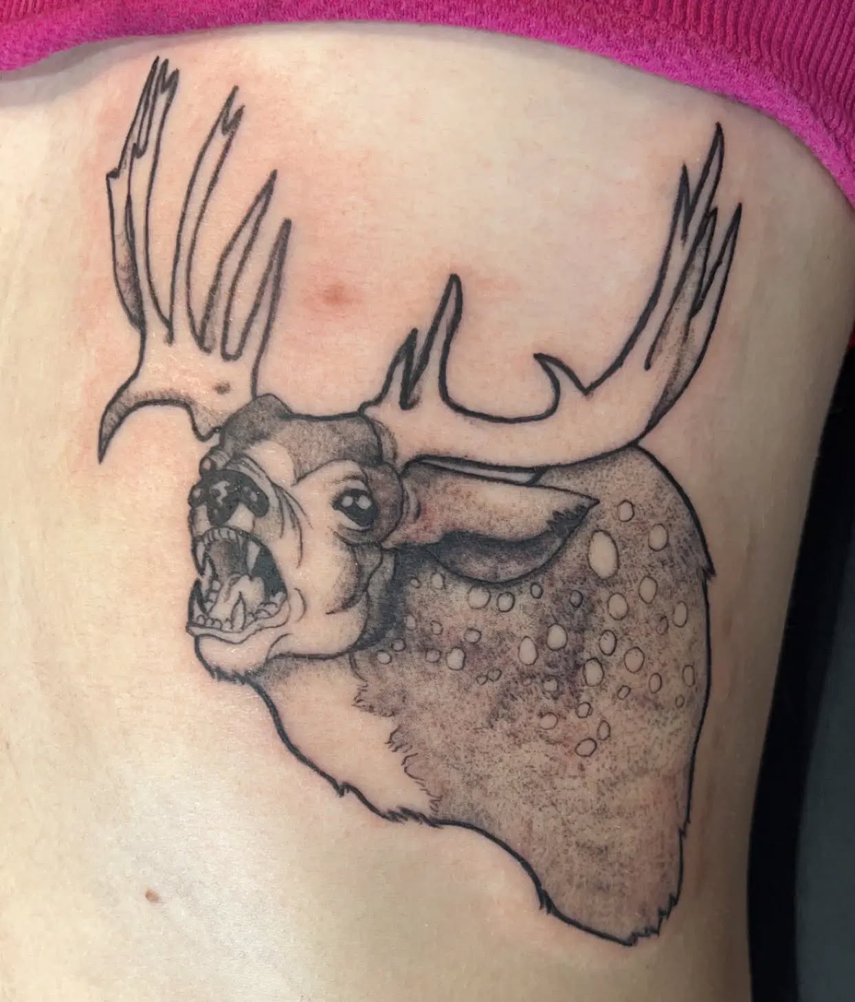 This side tattoo captures the raw power of a roaring stag mid-call. The detailed antlers and spotted hide contrast with the ferocity of its open mouth, symbolizing strength and dominance in nature. The shading brings depth and a lifelike feel to the piece.