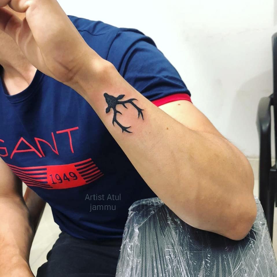 This small wrist tattoo features a simple yet striking antler design, shaped into a unique geometric form. The black ink gives it a bold and modern feel, perfect for those who prefer subtle tattoos with meaning.