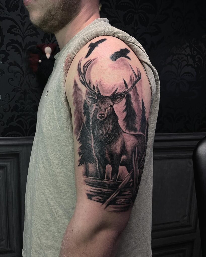 This upper-arm tattoo depicts a majestic stag standing strong in a forest clearing, surrounded by towering pine trees and crows flying above. The detailed shading gives it a cinematic and almost mystical vibe.