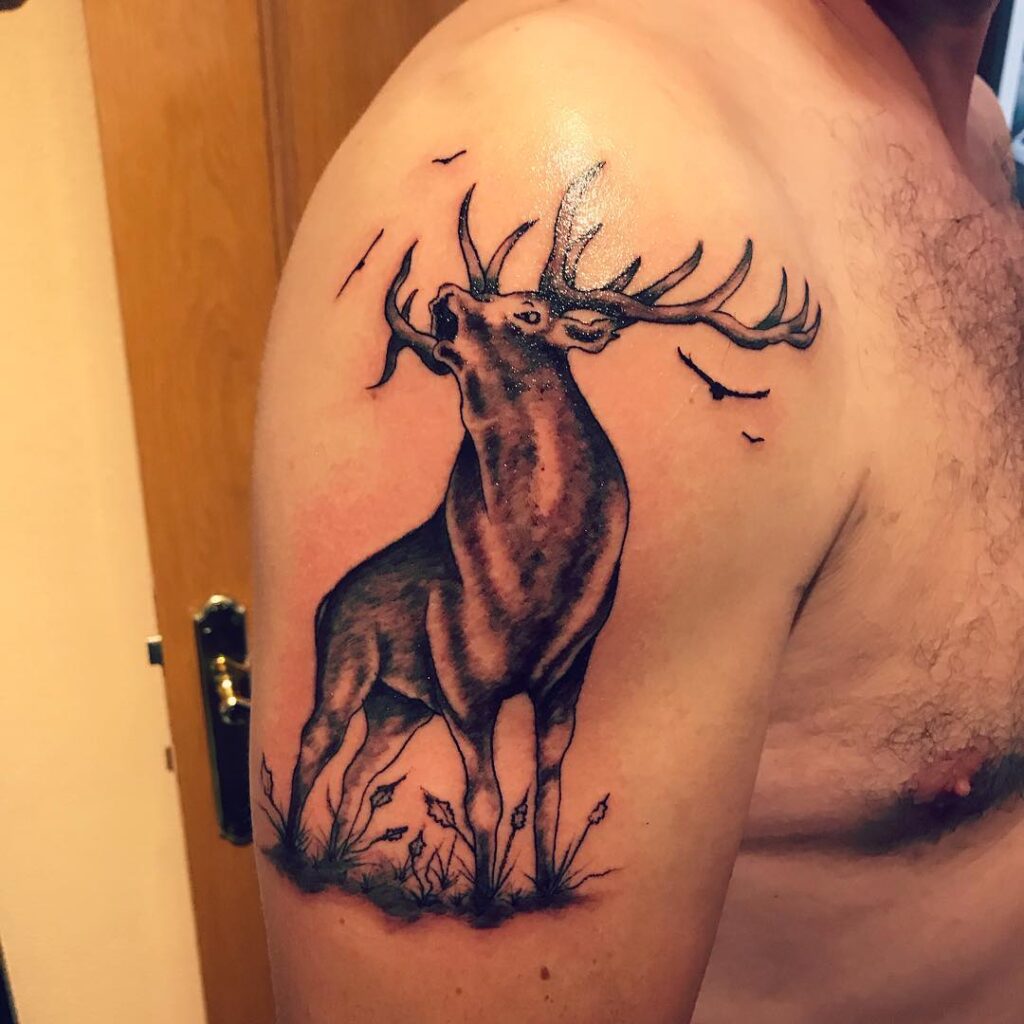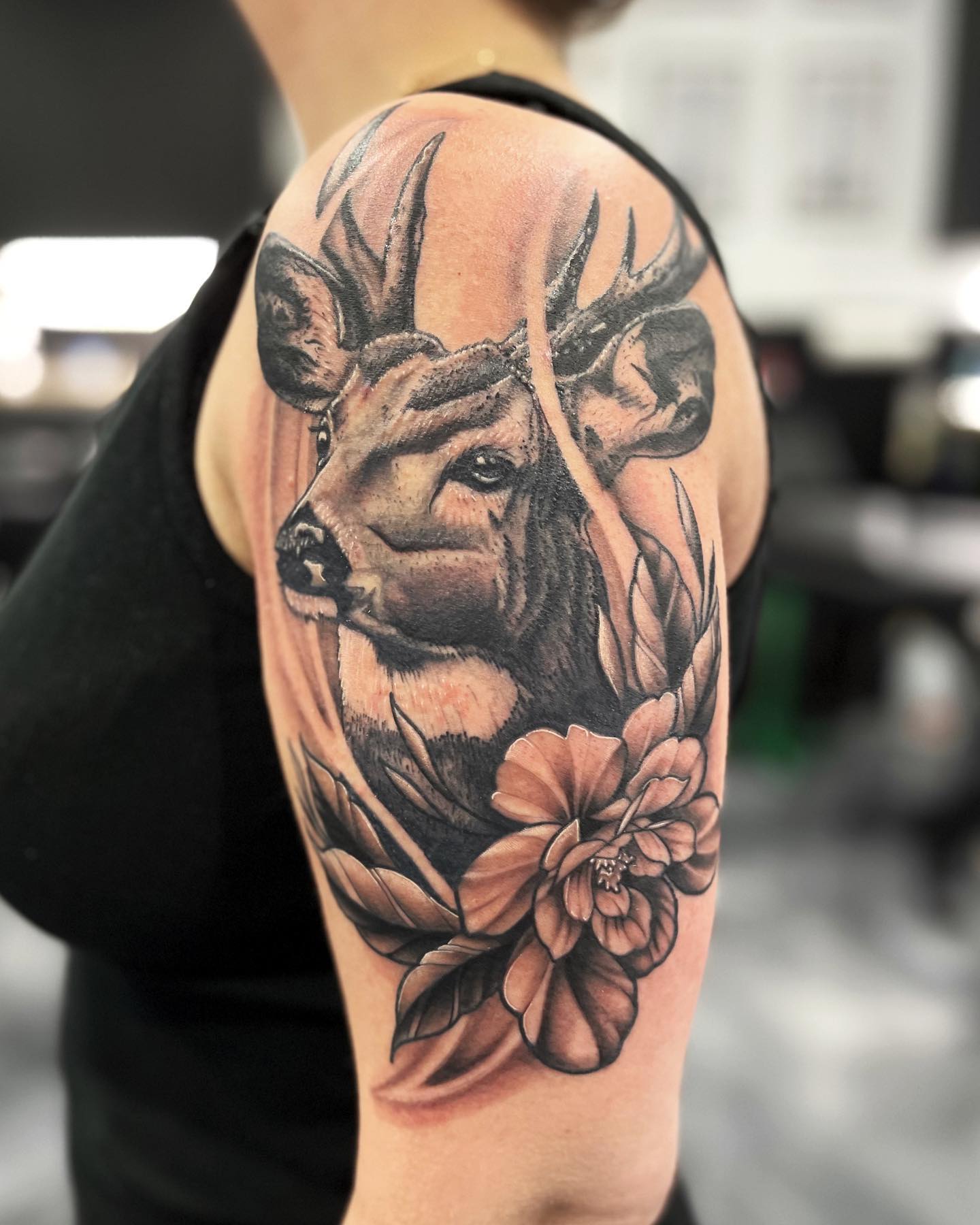 This tattoo blends the strength of a stag with the softness of floral elements, creating a beautifully balanced design. The stag’s head is detailed with realistic shading, while the surrounding flowers add depth and a touch of elegance, making the piece feel both fierce and gentle.