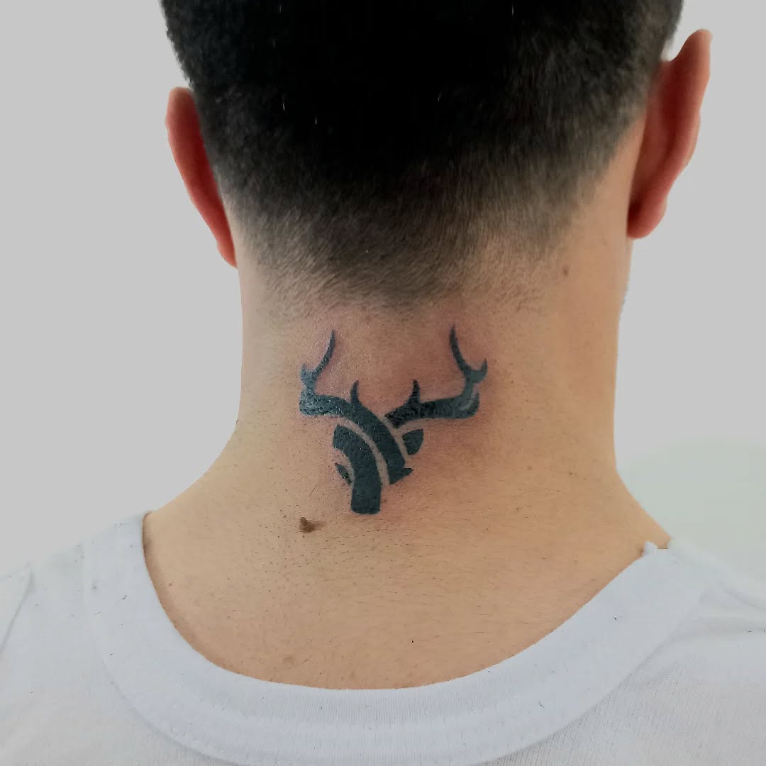 This small tattoo on the back of the neck uses tribal-style shapes to create the outline of stag antlers. The simplicity and symmetry make it sleek and eye-catching.