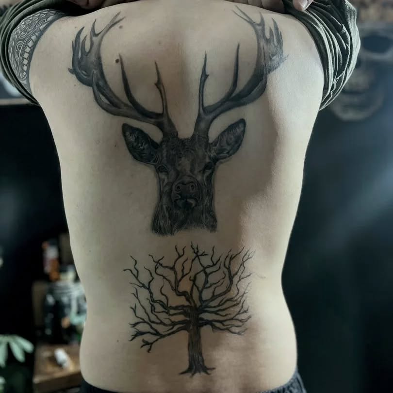 This powerful back tattoo features a stag head on the upper back and a leafless tree below, connected as if telling a symbolic story. The design suggests a link between strength, growth, and life’s cycles, with detailed linework enhancing its meaning.