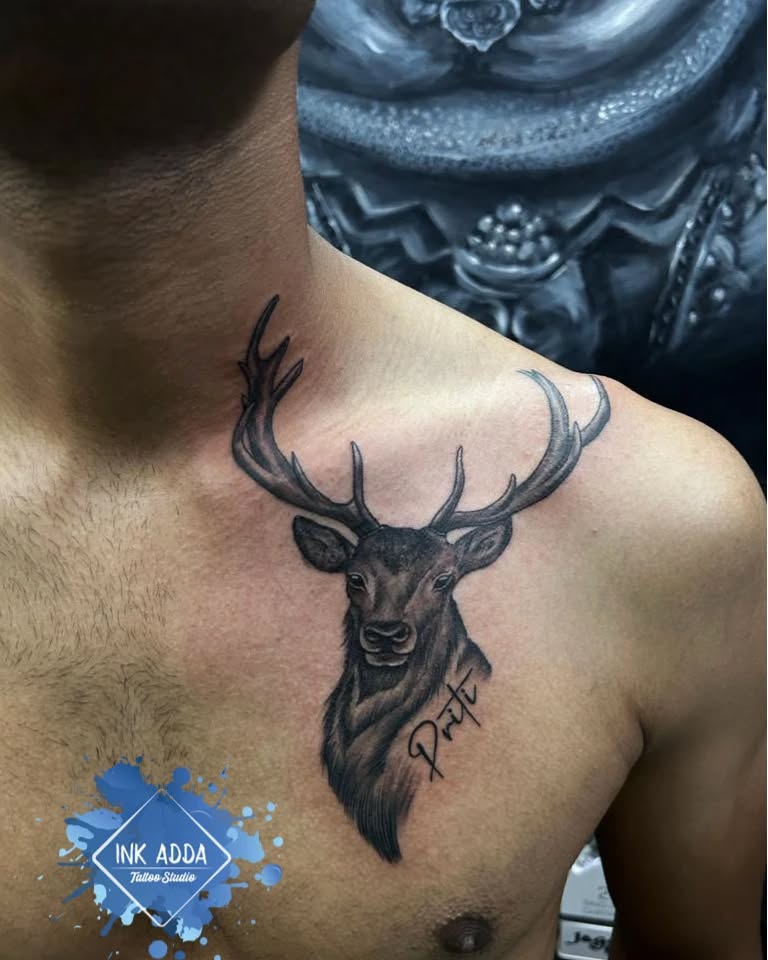 This chest tattoo features a lifelike stag head, its antlers elegantly framing the collarbone. The realistic detail makes the stag’s eyes appear almost alive, and the added personal name gives the tattoo a sentimental value.