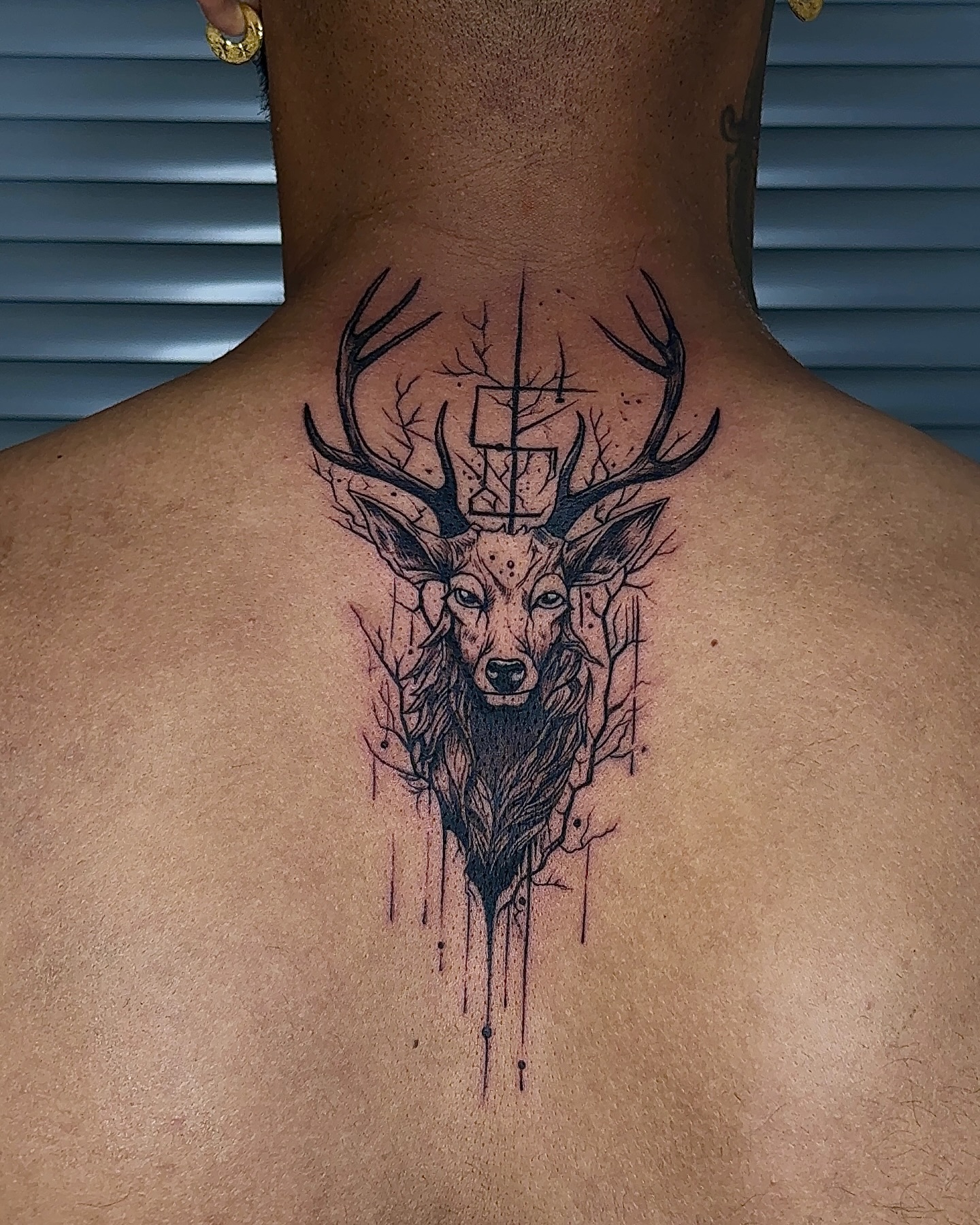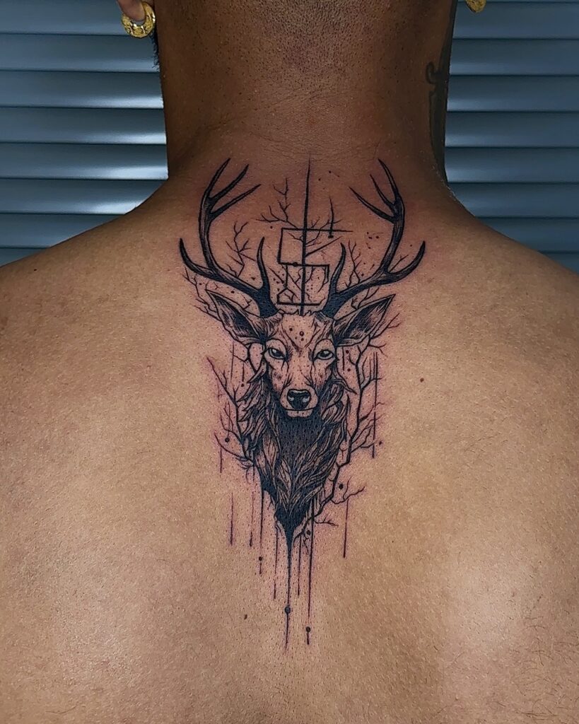 This striking upper-back tattoo showcases a stag head surrounded by fine linework and abstract watercolor-like splashes. The antlers branch out beautifully, while the dripping ink effect gives it a raw and modern aesthetic.