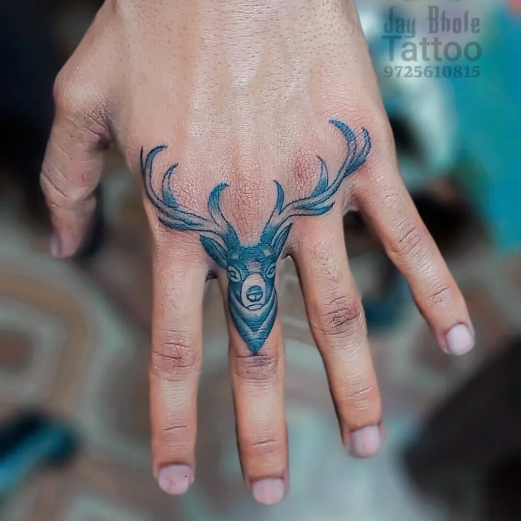This striking hand tattoo features a stag head with impressive antlers, done entirely in vibrant blue ink for a unique, standout look. The placement across the hand and fingers makes it a bold choice, immediately visible and commanding attention.