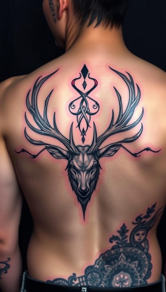 This tattoo is perfect for those who view the stag as a symbol of power, protection, and personal transformation. Placed on the back, it becomes a shield-like emblem that radiates confidence and primal energy, representing courage and spiritual growth.