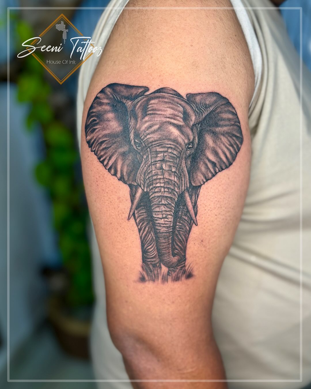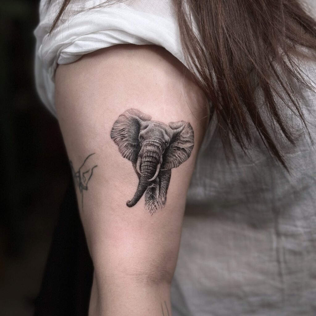 This highly detailed upper arm tattoo showcases a realistic elephant head, with deep shading that captures every wrinkle and crease. The artist’s precision creates an intense yet calm expression, symbolizing strength, patience, and protection. The placement on the bicep makes it a powerful statement piece for elephant lovers.