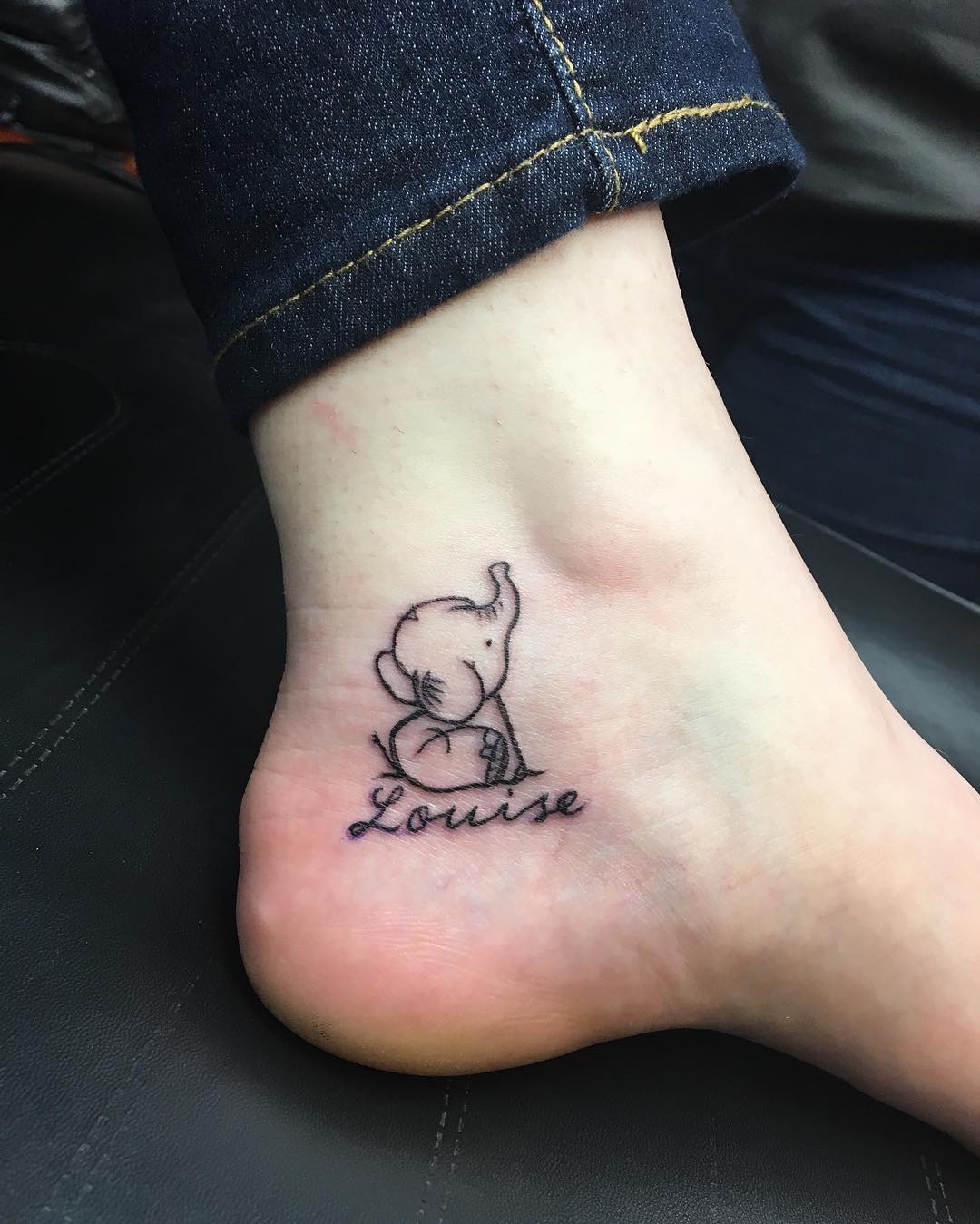 This ankle tattoo is a sweet and sentimental design featuring a simple baby elephant illustration paired with the name “Louise.” The minimal line art gives it a clean, modern look, perfect for a small but meaningful piece.