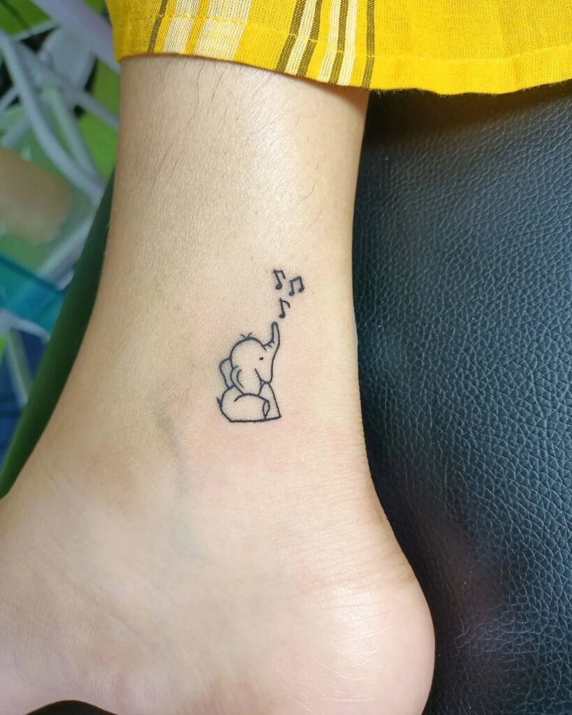 This ankle tattoo shows a small, adorable elephant accompanied by music notes, creating a playful and heartwarming design. Its fine lines and compact size make it a perfect choice for those who want a minimal yet expressive tattoo.