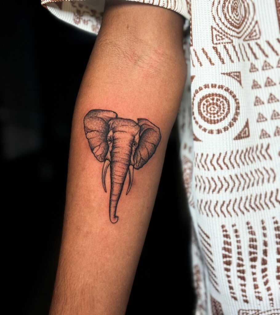This forearm tattoo features a detailed elephant head created with dotwork technique, giving it a textured, artistic look. The shading is precise, creating depth and character in the elephant’s features.