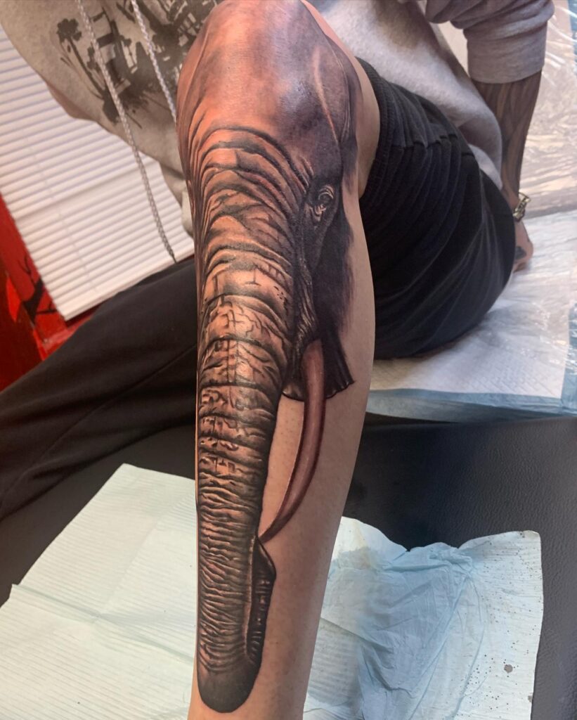 This large-scale tattoo covers the entire leg, featuring a hyper-realistic elephant head and trunk that flows seamlessly along the leg’s natural shape. The detailed wrinkles, shading, and tusk work give the piece an almost photographic quality, making it a stunning display of artistry and dedication.