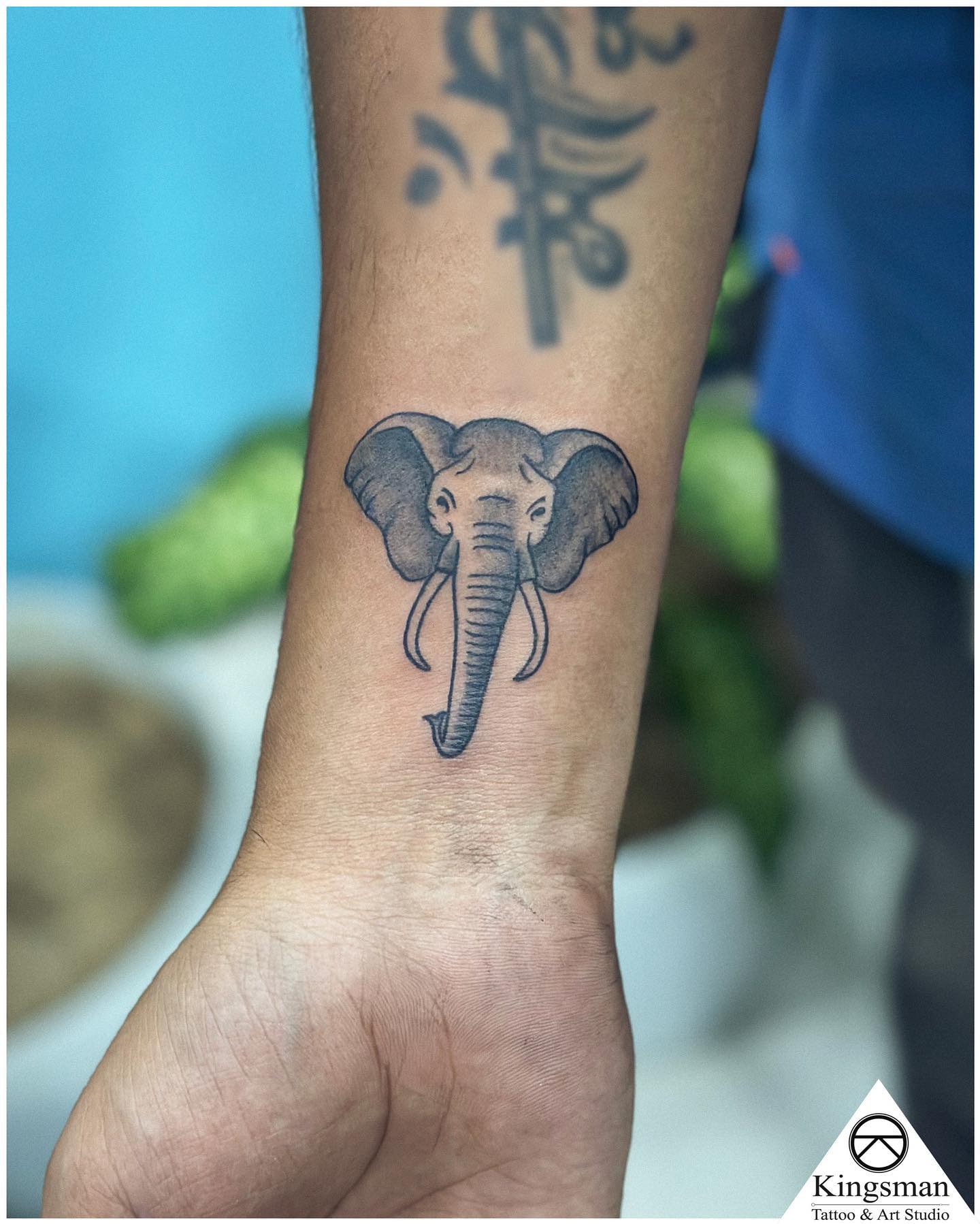 This small wrist tattoo features a clean and detailed elephant head, with shading that brings out the animal’s calm and wise expression. Its placement on the wrist makes it easily visible and a constant reminder of strength and grounding.