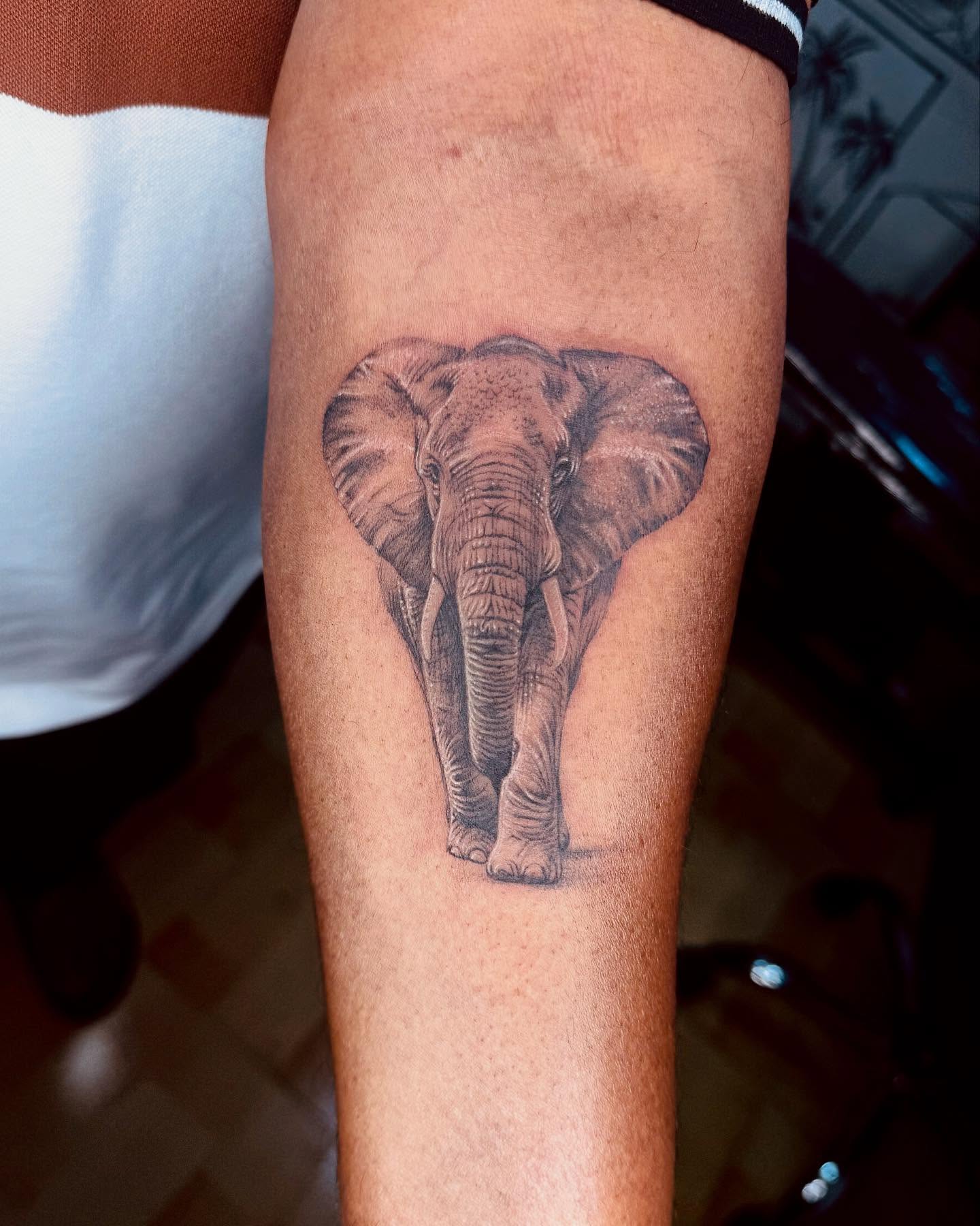 This inner arm tattoo features a meticulously shaded elephant head, creating a strikingly realistic look. The smooth gradient of black and gray adds depth and dimension, making the elephant appear almost three-dimensional.