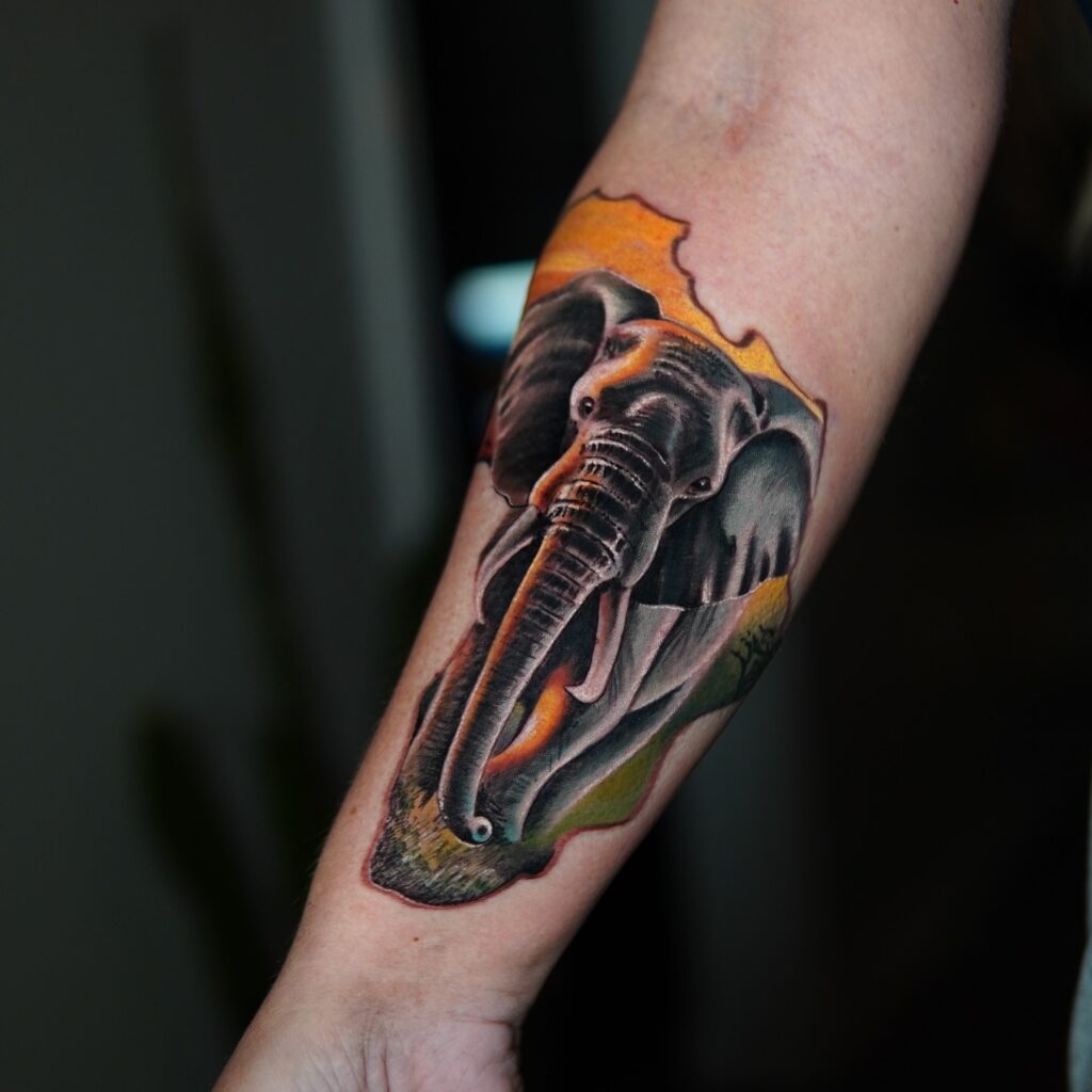 This stunning forearm tattoo features a majestic elephant emerging from the shape of the African continent, symbolizing strength, heritage, and a deep connection to the wild. The warm sunset colors in the background add a sense of serenity and natural beauty, making the design stand out as both meaningful and artistic.