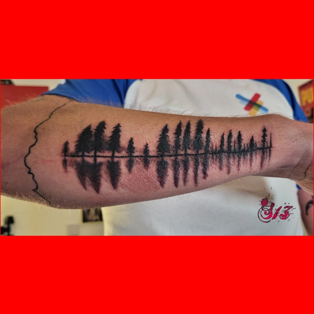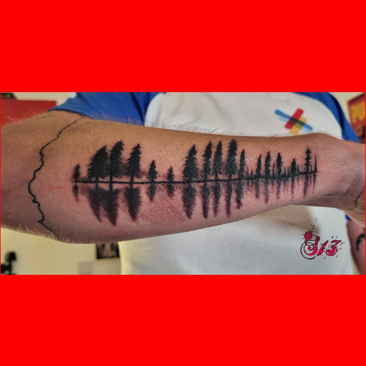 This striking tattoo depicts a line of trees mirrored in water, creating a serene reflection effect across the forearm. The ink work emphasizes symmetry, making the design appear balanced and calming. The way the trees extend both above and below the line gives it a dreamlike, almost meditative feel.
