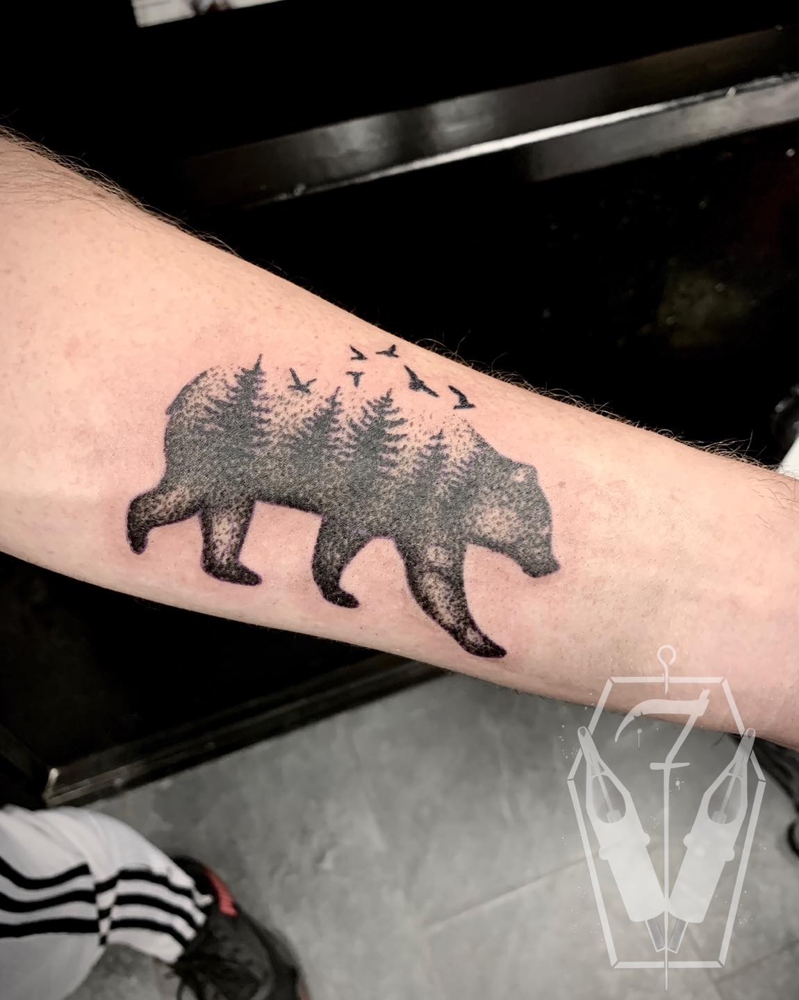 This tattoo cleverly places a forest landscape within the silhouette of a bear. Towering pines and flying birds are etched inside the animal’s frame, seamlessly blending wilderness and wildlife. The design is bold yet soft, showing off intricate details while maintaining a strong visual impact.