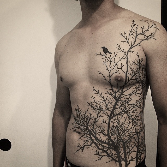 This detailed design stretches across the chest and torso, depicting a tree with intricate branches reaching upward. A lone bird rests on the branches, adding both delicacy and symbolism. The tattoo flows naturally with the body’s shape, making it visually impactful and deeply meaningful.