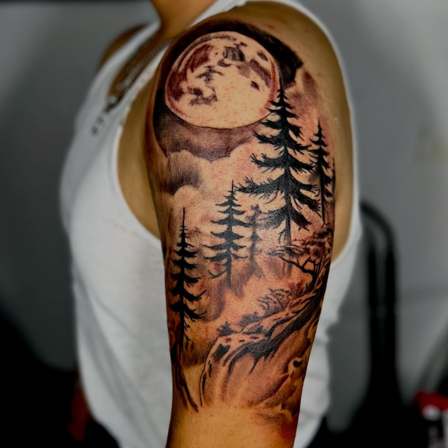 This tattoo depicts a dramatic forest scene illuminated by a large, glowing moon. The shoulder placement allows the design to flow naturally, with tall trees climbing upward against the night sky. The shading creates depth, bringing the moon’s glow to life.
