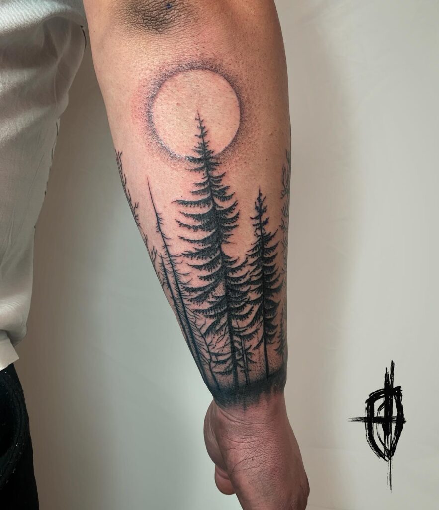 This forearm tattoo showcases tall, slender pine trees beneath a perfectly rounded moon. The moon glows softly while the detailed forest stretches upward, creating a clean and balanced composition. The fine line work enhances the elegance of the design.