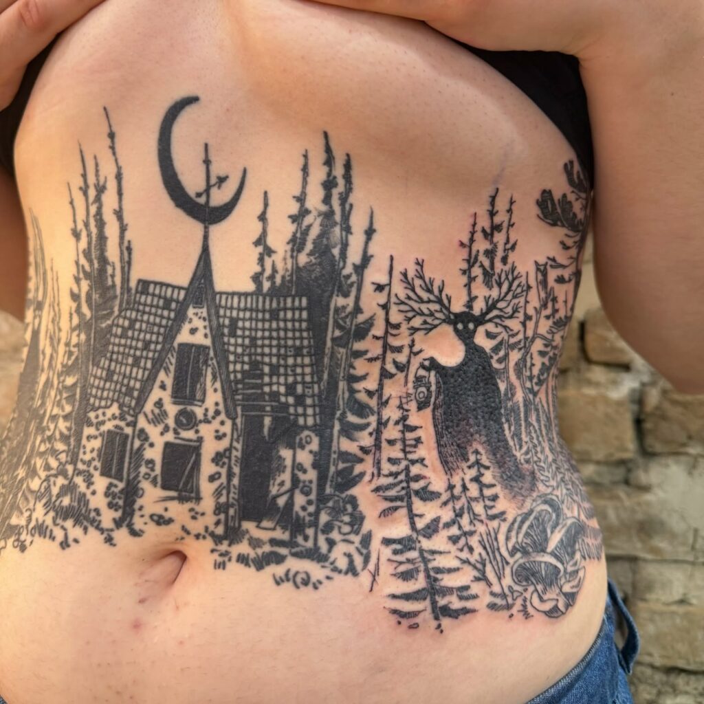 This tattoo illustrates a magical forest scene with tall trees, a moon above a cabin, and a mystical deer-like creature. The shading and whimsical elements give it a fairytale quality, merging nature with fantasy. Every detail—like the mushrooms and textures—creates a story on the skin.