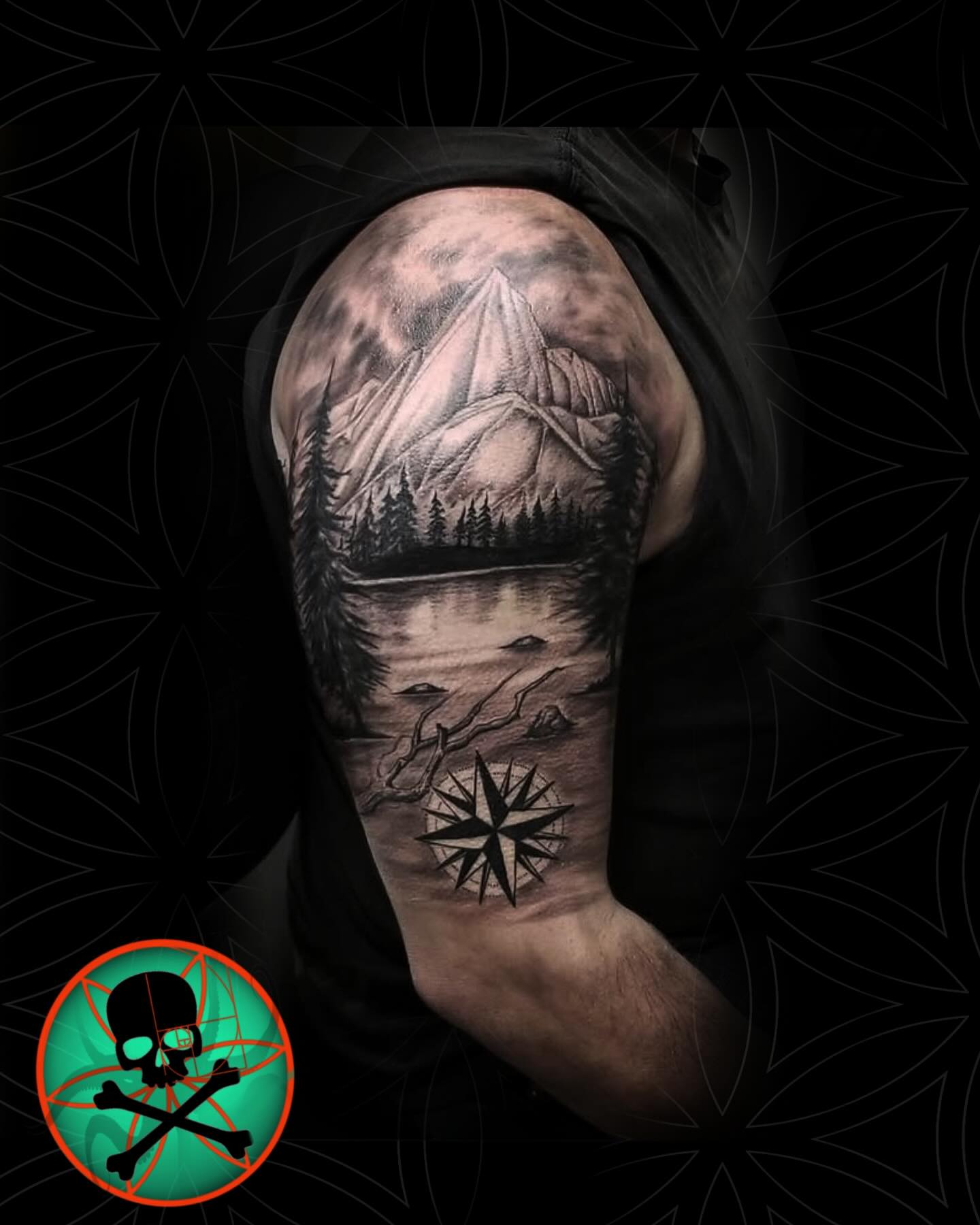 This bold shoulder tattoo combines towering mountains, a serene forest, and a detailed compass rose. The intricate shading highlights depth and texture, while the compass at the bottom ties the design together with symbolism of guidance and direction.