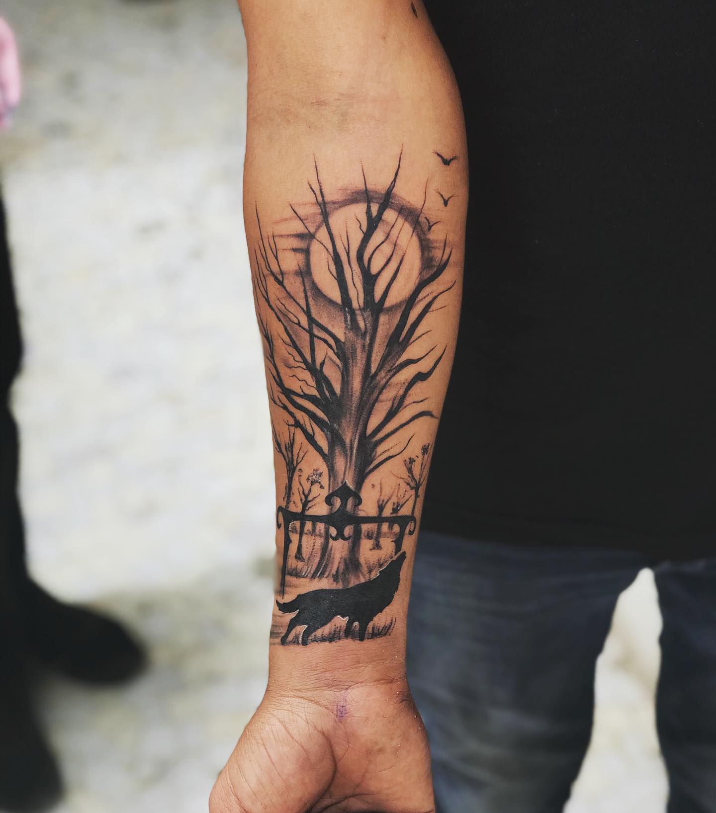 This tattoo portrays a lone wolf howling beneath a towering tree with bare branches. Above, a glowing moon framed by subtle shading radiates mystery and depth. The composition flows down the forearm, creating a vertical story that feels alive and dramatic.