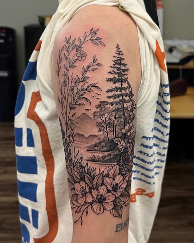 This tattoo blends forest elements with delicate floral details for a design that feels lush and serene. A tall pine tree rises above a scenic background of mountains and water, while blossoms and leaves fill the foreground. Birds flying above add a touch of life and motion to the piece.