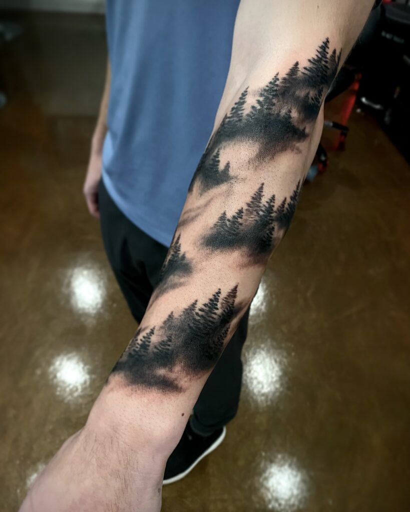 This tattoo captures the mystery of a fog-covered forest wrapping elegantly around the arm. Layers of pine trees fade into soft shading, creating the illusion of mist drifting through the woods. The design flows seamlessly with the arm, giving it a natural and immersive appearance.