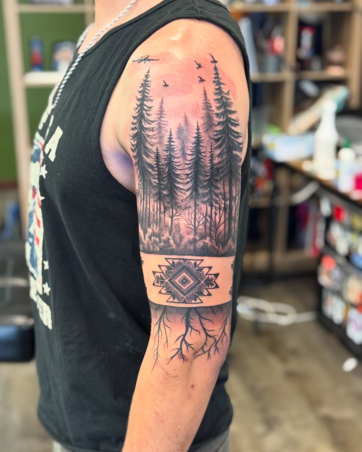 This bold tattoo combines towering pine trees with tribal-style geometric elements wrapping around the arm. Birds flying above the forest add motion, while the roots flowing below the geometric band ground the design in strength and stability. The contrast of detailed shading and sharp lines creates visual depth.