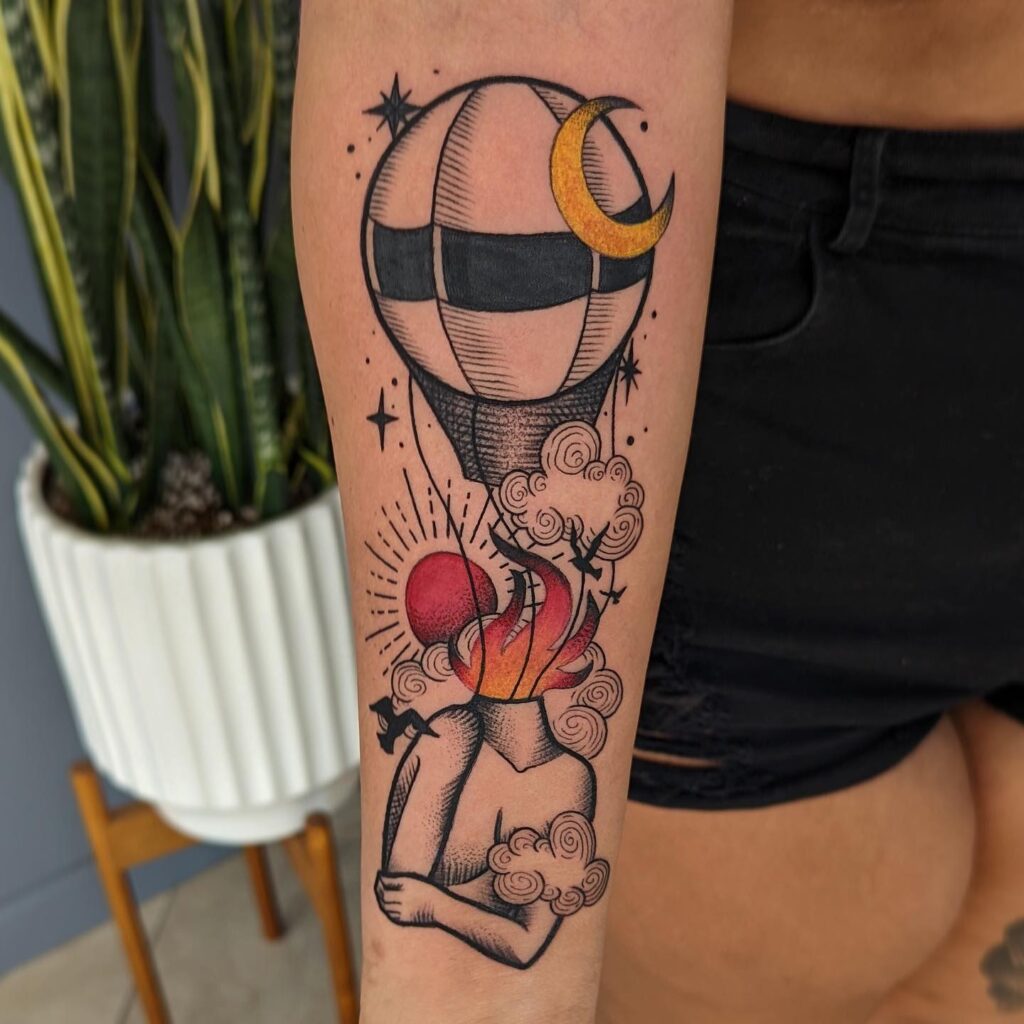 This unique tattoo merges surrealism with cosmic imagery. A monochrome hot air balloon floats above a headless figure, where flames and clouds emerge in a striking, dreamlike flow. A golden crescent moon and scattered stars frame the balloon, adding a mystical atmosphere.