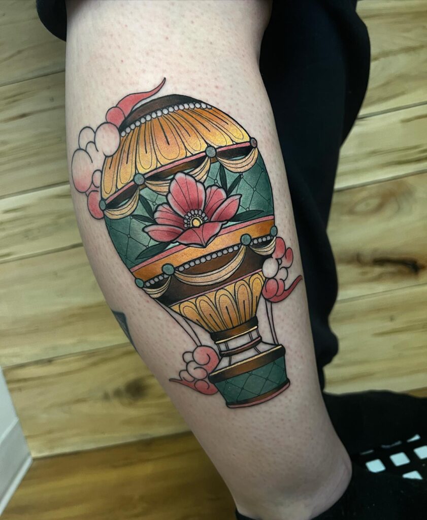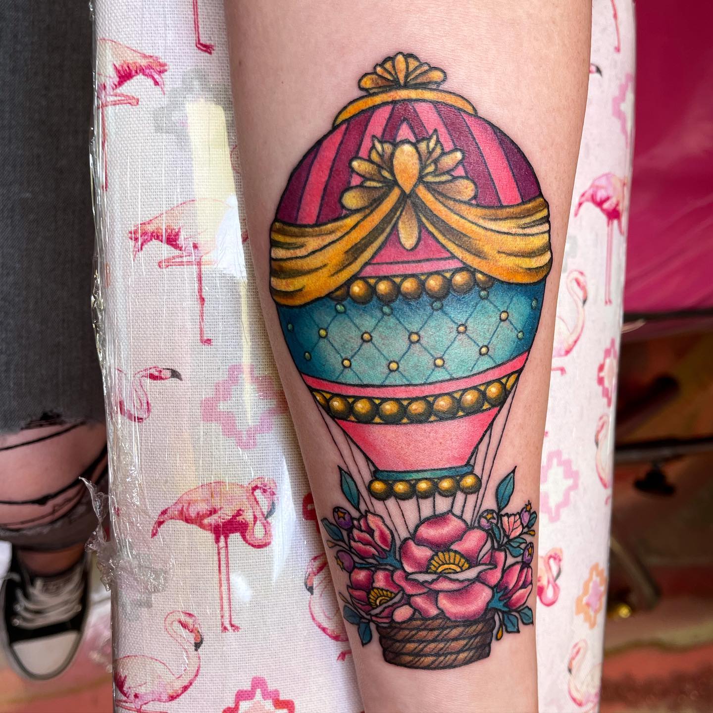 This tattoo shines with vibrant jewel tones—pink, teal, and gold. Draped with golden curtains and crowned with ornate details, the balloon resembles a luxurious ornament. The basket brims with blooming flowers, further enhancing its sense of richness and life.