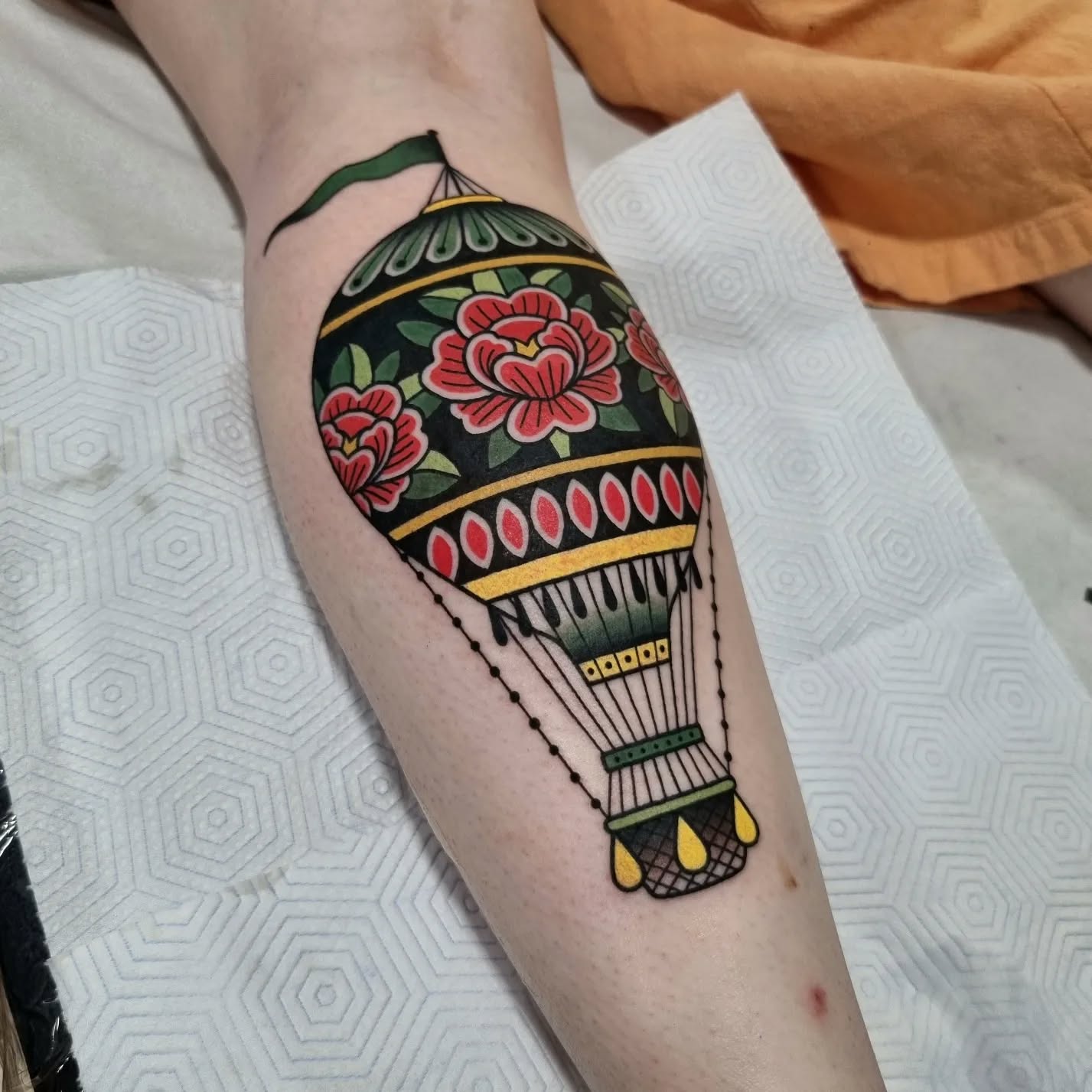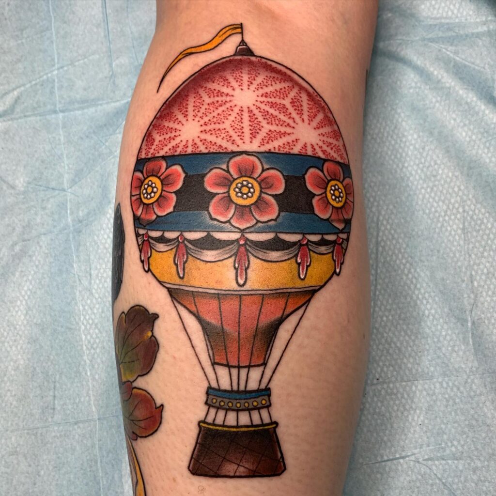 Decorated with rows of red flowers and intricate patterns, this hot air balloon tattoo captures a rich ornamental feel. Its warm tones—reds, yellows, and blacks—blend seamlessly with the floral elements, creating a striking yet elegant vintage design.